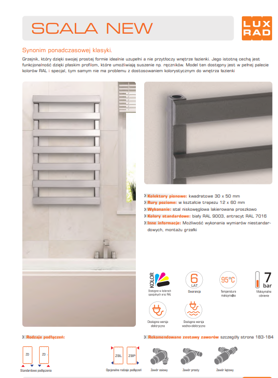 Konstrukcja grzejnika Scala New przywodzi na myśl budowę drabiny. Wszystko za sprawą specjalnemu układowi stworzonemu z poziomych paneli w kształcie trapezu, które zwieńczone zostały po obu stronach pionowymi kolektorami o kwadratowym przekroju. Całość tworzy nowoczesny efekt i może być stylowym uzupełnieniem wyremontowanej łazienki. Istnieje możliwość zamówienia grzejnika w niestandardowym rozmiarze oraz wybrania odpowiedniego koloru z palety RAL.