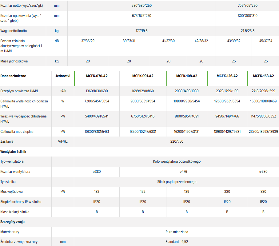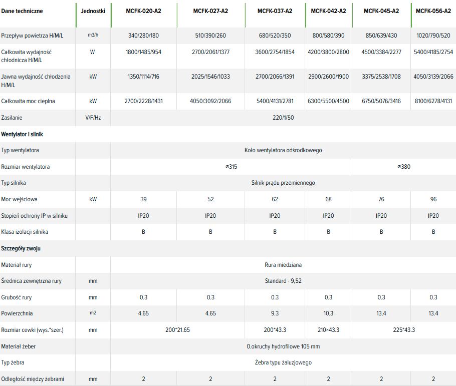 Dane techniczne, wydajności klimakonwektorów MCFK-...-A2