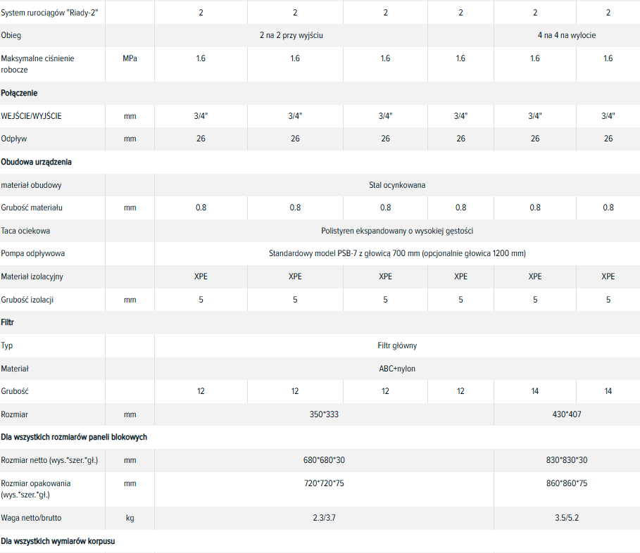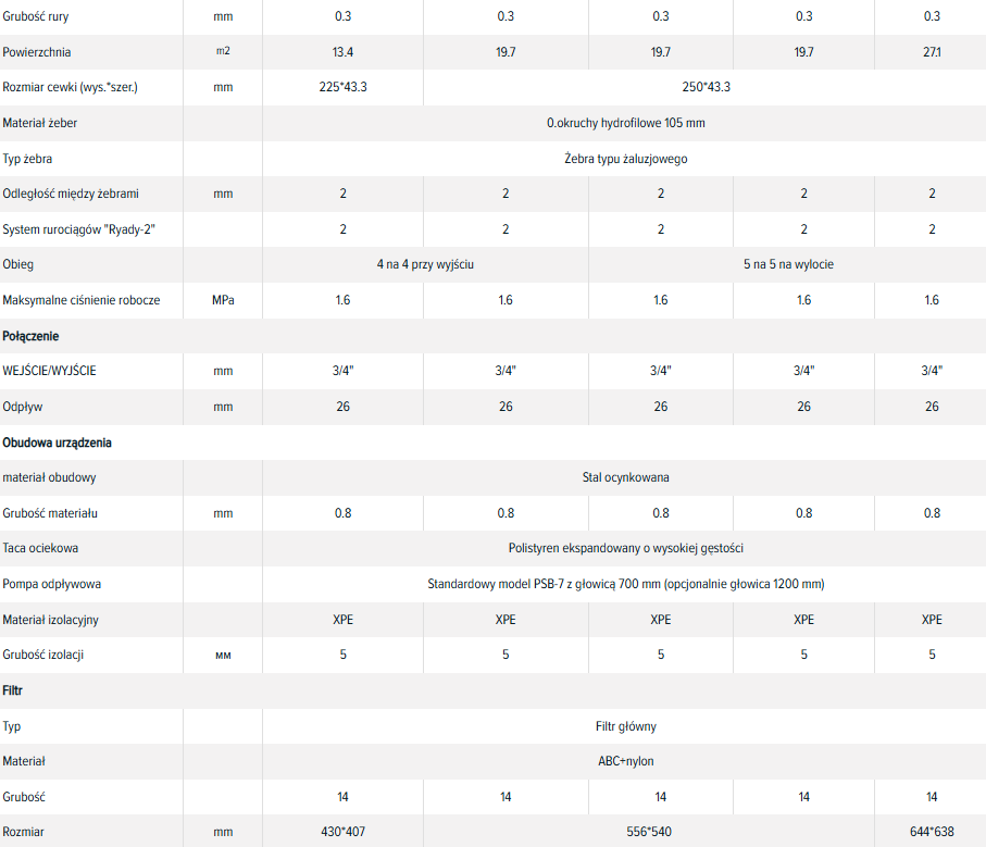- Wymiennik ciepła wykonany jest z miedzianych rurek i aluminiowych płyt pokrytych niebieską powłoką ochronną, co zapewnia wysoką wydajność wymiany ciepła. Każdy wymiennik ciepła jest testowany pod kątem szczelności przy ciśnieniu 16 barów (1,6 MPa).