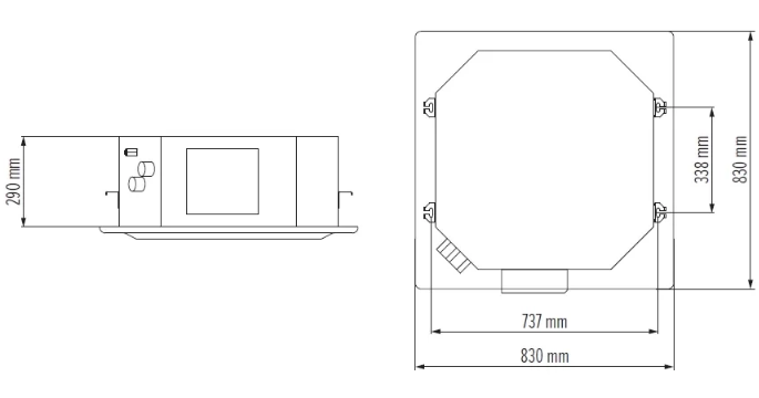 - Obudowa wykonana jest z galwanizowanej stali i wyposażona w formowane kanały powietrzne z polistyrenu, które zapewniają wydajny przepływ powietrza i są wystarczająco grube, aby zapewnić niezawodną izolację cieplną i akustyczną.