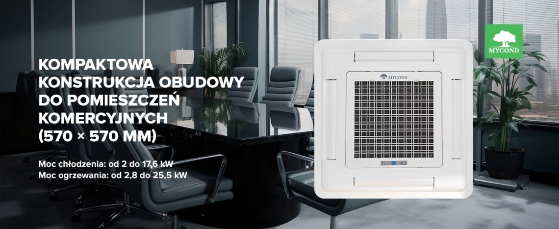 Klimakonwektory kasetonowe produkowane przez MYCOND są zaprojektowane do zastosowania do różnego rodzaju pomieszczeń. Klimakonwektor montowany jest w przestrzeni pod sufitem. Dzięki kompaktowej konstrukcji i niewielkiej wadze, klimakonwektory serii MCFK-A2 mogą być instalowane bez użycia specjalnych narzędzi. Klimakonwektor oprócz trybu grzania pozwala na efektywne wykorzystanie trybu chłodzenia POMPY CIEPŁA.